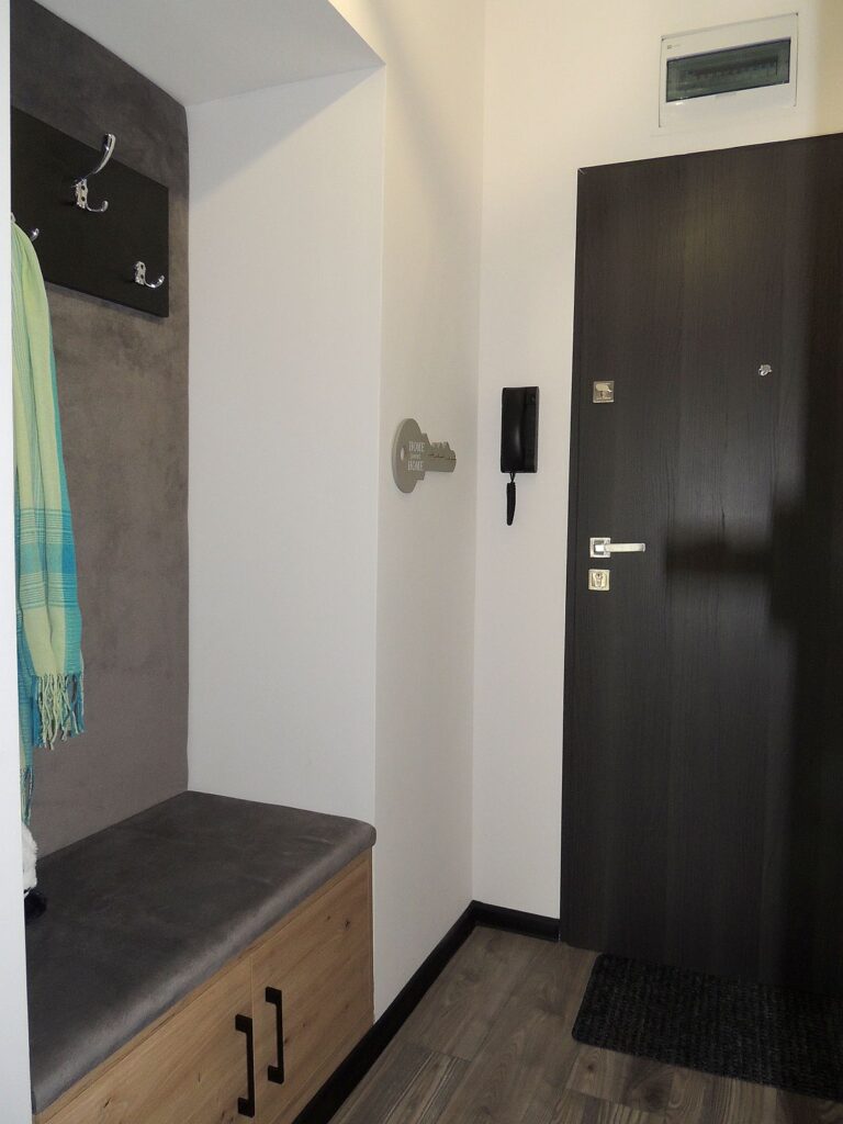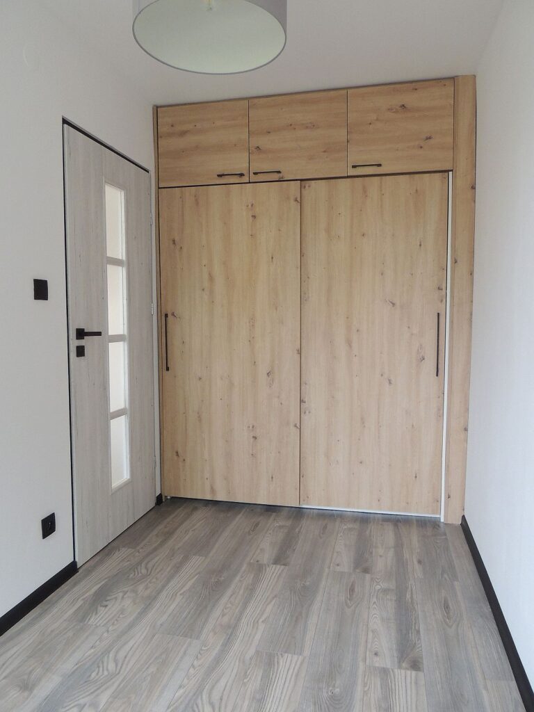 W łazience kabina prysznicowa i toaleta, w przedpokoju siedzisko z szafką. Nowe drzwi zewnętrzne i wewnętrzne. W sypialni szafa w zabudowie.